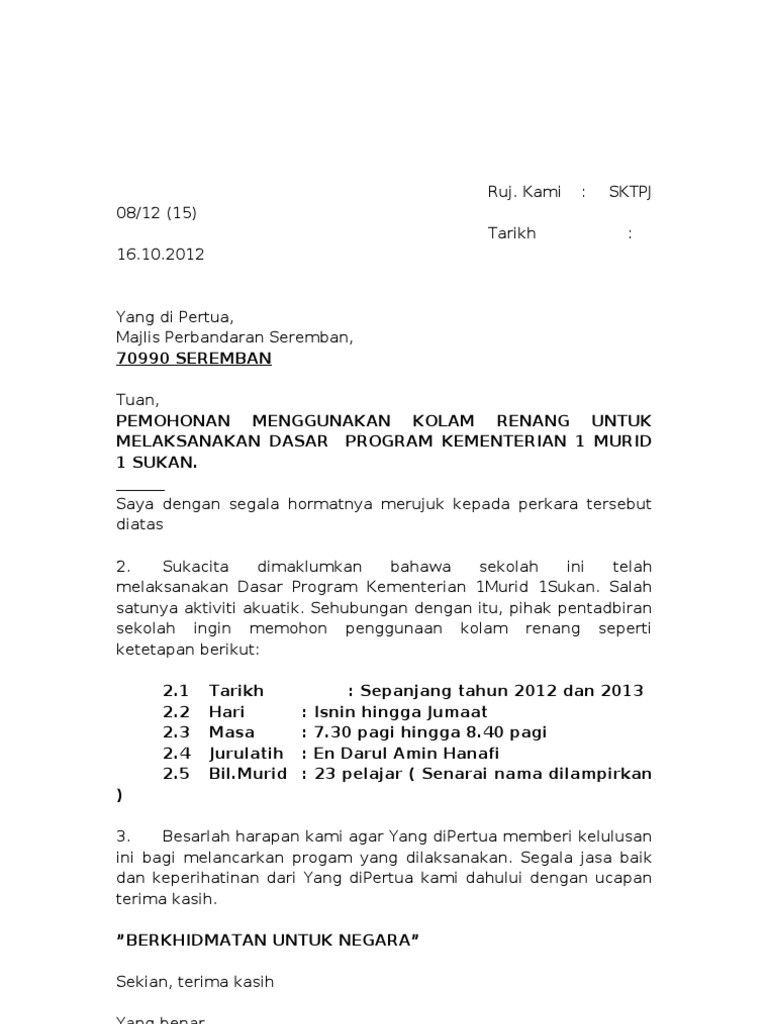 Contoh Surat Untuk Menggunakan Kolam Renang